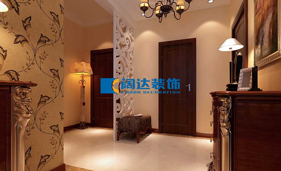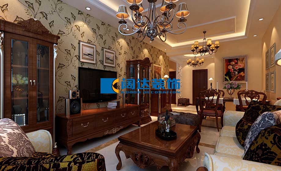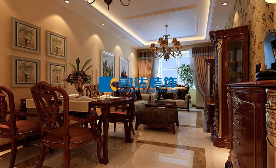 客餐廳:本案例用暖色的燈光烘托歐式的華貴檔次,深色歐式家具配以淺綠色的葉子型壁紙,為家居空間增添了一絲生命活力,玄關(guān)區(qū)域的圓形吊頂與客餐廳區(qū)域的方形吊頂配合地面的撥打線斜鋪拼花對空間功能進(jìn)行了明確的劃分,提升了家居空間的整體檔次。