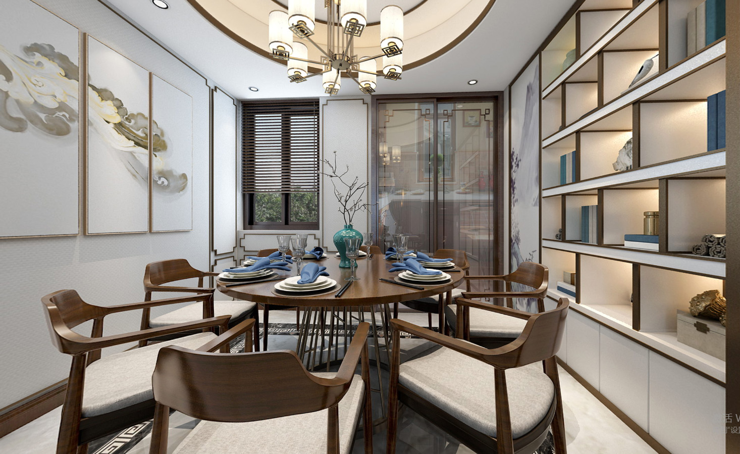 簡約的空間形制,給予人一種回歸自然、俯仰自得的圓融自在感,傳統(tǒng)而溫馨的圓桌,中式青瓷搭配肆意生長的枝椏,別有一番鮮麗動人的意韻,居住的詩意成了狹小空間里的一小片風(fēng)景。