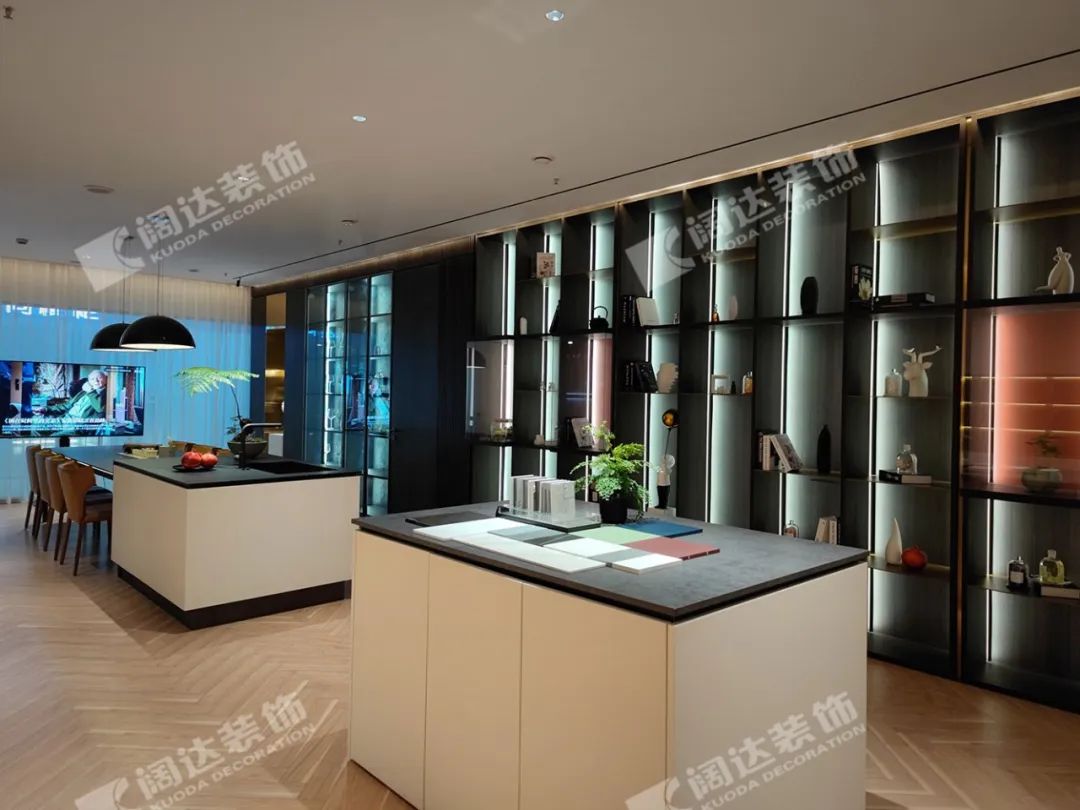 社交洽談區(qū)域采用當(dāng)代最流行的膚感飾面制作一體化島臺(tái)桌面,既提升品質(zhì),又有觸碰島臺(tái)桌面時(shí)的舒適感,在餐桌的前后分別有大面積的玻璃酒柜和可封閉式西廚操作臺(tái),桌面邊上采用軌道插座,實(shí)用的設(shè)計(jì),滿足了用餐和辦公的雙重需求。