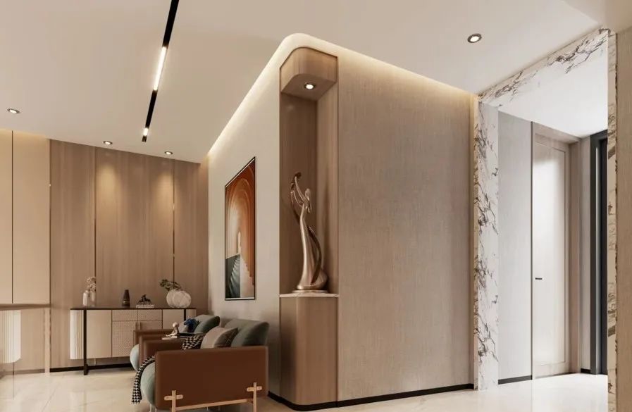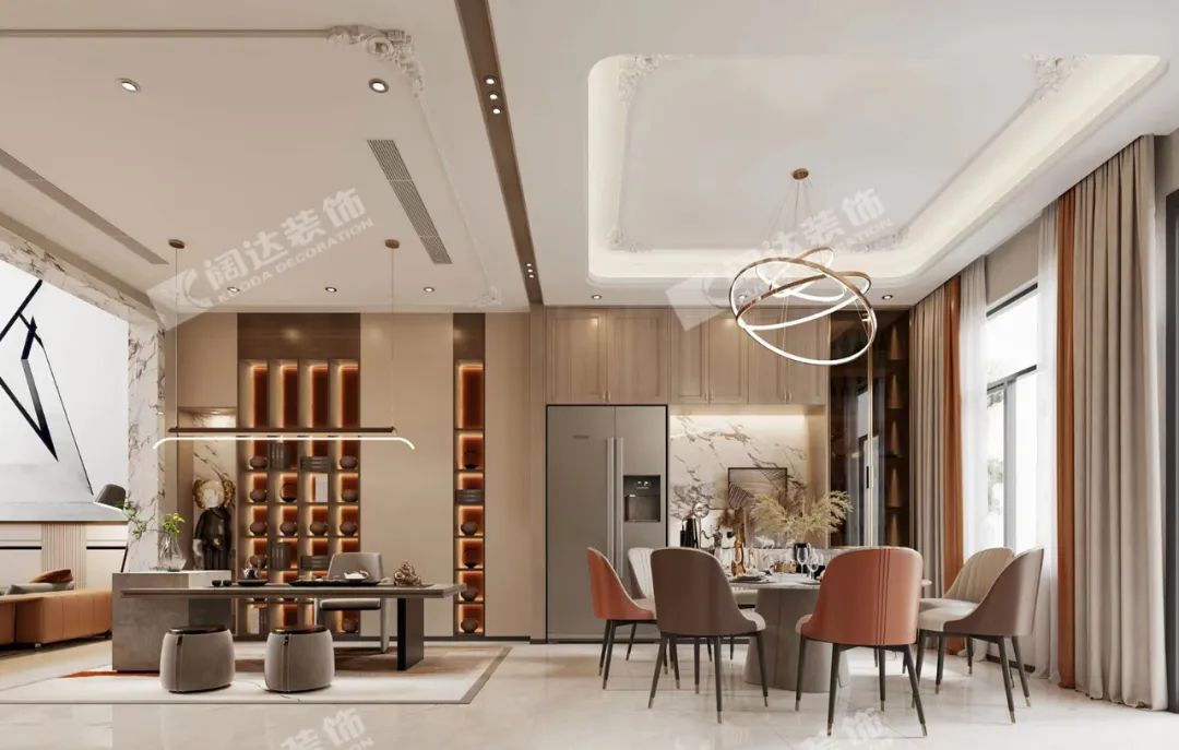 客廳溫暖明亮,經(jīng)濟耐看是本案的主要需求之一,剔除了法式復(fù)雜的線形后,融入了現(xiàn)代溫暖明亮的暖色系風格,材質(zhì)上搭配巖板,給予了視覺上的沖擊力,成為業(yè)主期待的理想之家。
