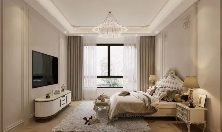 主人房:亞麻色的墻面因為石膏線的加入增加了不少立體度,搭配低飽和度顏色,也能打造出不一樣的視覺感受,適度加一點角花裝飾,提升層次感的同時,盡顯優(yōu)雅。