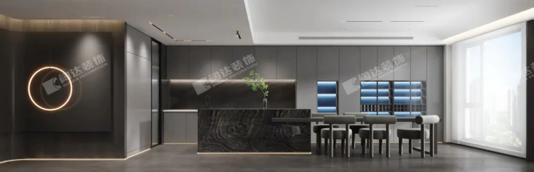 將廚房與餐廳打通,視覺上連為一體,前后呼應(yīng),中島式的設(shè)計在餐廳增添了社交趣味的同時,又考慮了餐廳的儲物收納。大理石與趣味雕塑相遇,在下照燈的光影下,呈現(xiàn)出塊面的立體感,傳達(dá)著亙古不變的高級與時尚。落地窗良好的采光和視野,更在這看似低調(diào)的氛圍中,渲染出一層兼收并蓄的微妙氣質(zhì)。