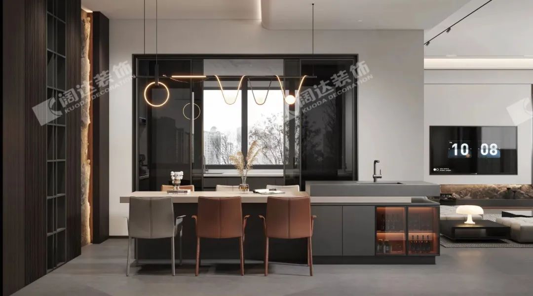 餐廳大島臺既可以作為日常的餐吧臺使用,又能滿足烹飪操作之需,柜體區(qū)域還能用作大容量收納空間。