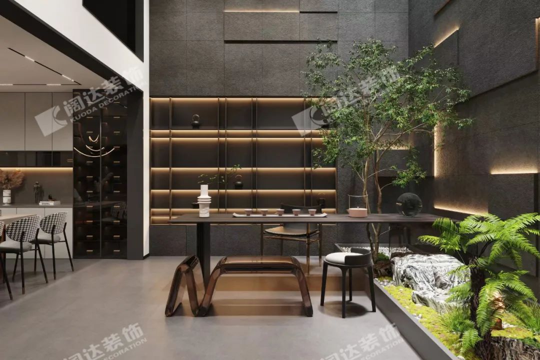 地下室茶室:設計,源于生活,更優(yōu)于生活。將自然與室內結合,適當增加綠植,不僅增強了空間與自然的溝通和互動,也緩解了地下室相對閉塞的通病,有了細致與粗獷的反差,為生活增添一些新鮮感。