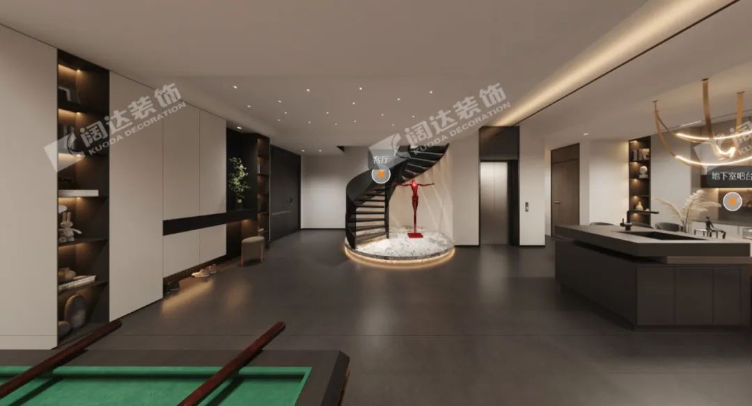 地下室入戶玄關:從地下車庫進入室內,儲物柜與換鞋區(qū),被精心地設計成一處自然景觀,搭配星空頂,讓家更添藝術氣息與夢幻感,鋼結構的旋轉樓梯也保證了地下室的通透性和呼吸度。“回歸本真安寧的生活,從家開始。”