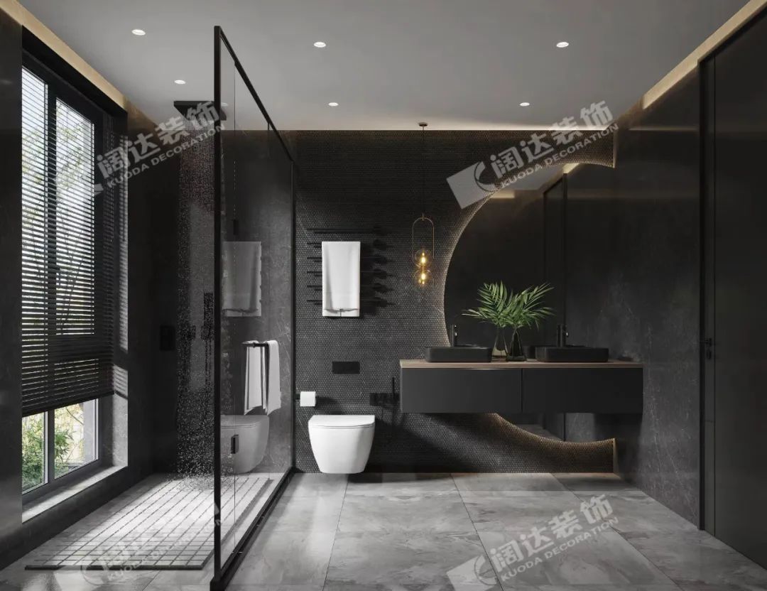 主衛(wèi):落地窗引入光線,以光為媒介,在黑色空間交錯、吸引。各式燈光,交織譜寫,跳躍多變。黑色和燈光的相互碰撞,就像我們體內潛藏著兩個靈魂,好似對立,又互相融合。
