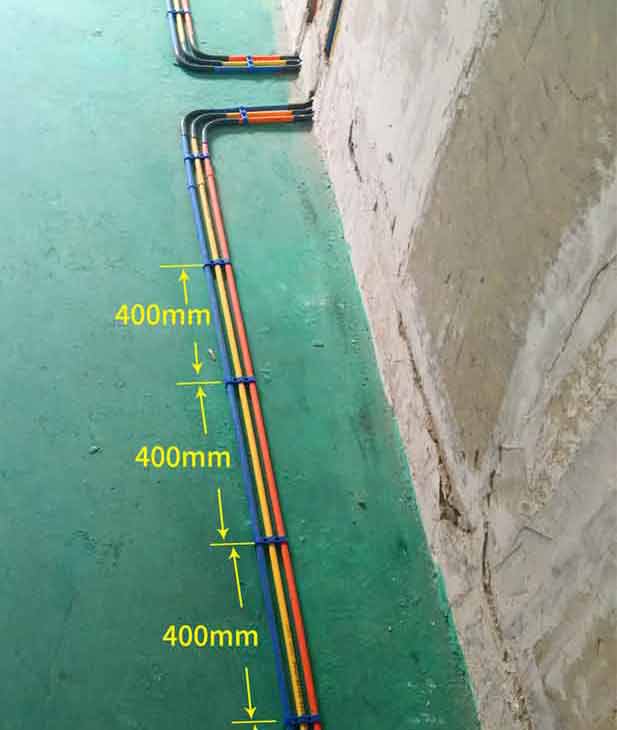 單管單線施工工藝地面配管必須使用10(mm)PVC阻燃線管(公司專利材料),并距墻體200mm間距沿墻敷設(shè),多根管敷設(shè)時,必須并行、整齊排列,盡量減少管線的交叉和重疊。